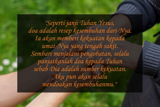 Hal ini tidak lain untuk memberikan semangat dan dukungan bagi teman, sahabat, atau orang di lingkungan sekitar yang sedang tertimpa musibah . Doa untuk sahabat atau teman yang sakit. Aku memohon kepada allah yang agung, tuhan arasy yang megah agar . Syafakallahu saqamaka, wa ghafara dzanbaka, wa 'afaka fii diinika wa jismika ilaa muddati ajalika. Aku hanya bisa berdoa dan berharap agar kau lekas sembuh dan bisa bersama kita lagi. Ya allah wahai tuhan segala manusia, hilangkanlah penyakitnya, sembukanlah ia.